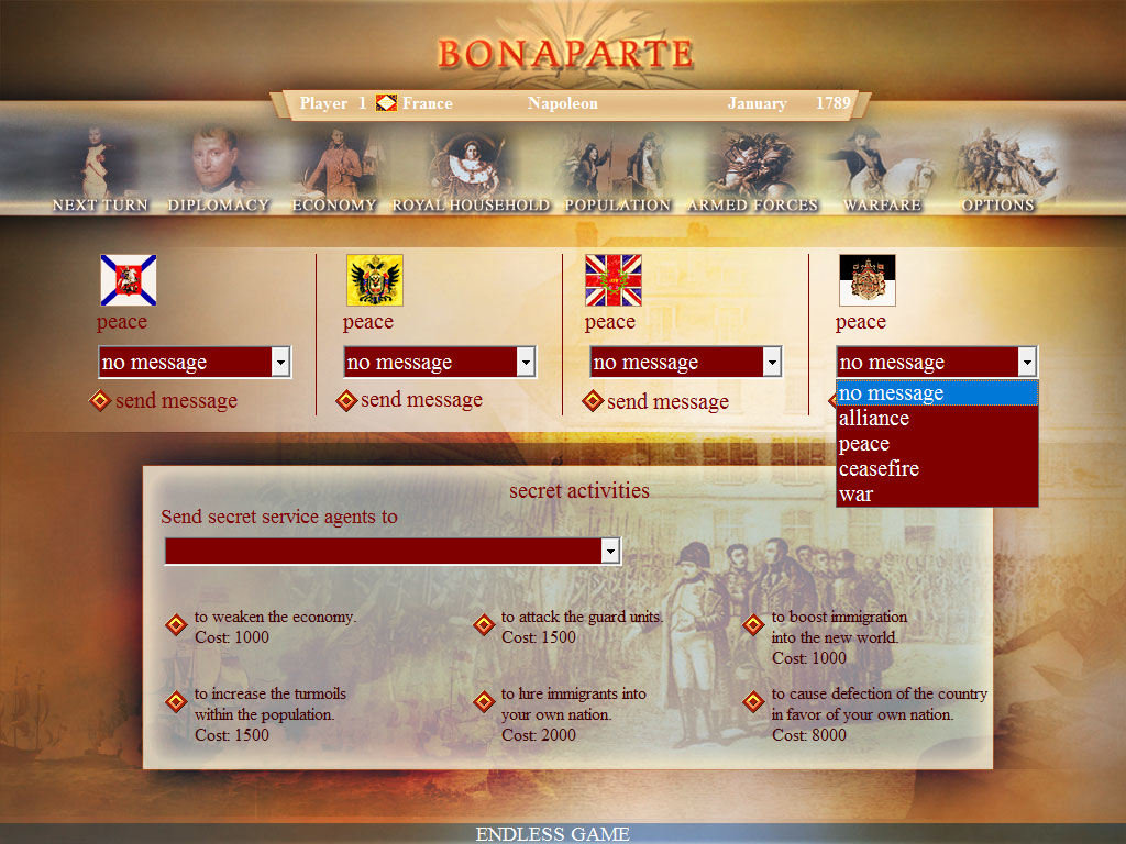 Wählen Sie eine von 5 Nationen (Frankreich, Preussen, Österreich, Russland oder Großbritannien) und führen Sie diese durch die nächsten 70 Jahre. Es können 1-5 Spieler an einem Rechner spielen. Außerdem kann man historische Szenarien nachspielen.